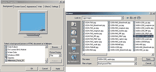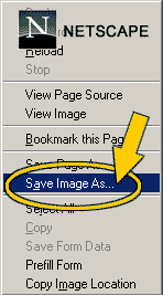 NETSCAPE, click on the display size of your monitor from the list on the right. When the photo completely loads, right click on the photo and select the option "Save Image As." Place the image in a folder that you can access easily, for example the main Windows folder, or My Pictures. Go to your Control Panel and select Display/Background and browse until you find the photo. Select it and click on OK. Be sure that your Picture Display option is set to "Center." |